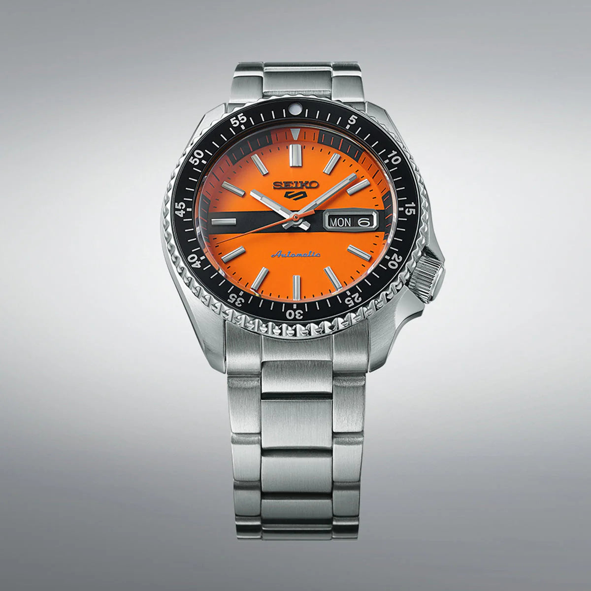 The SRPK11K1 immediately grabs attention with its vibrant orange dial — a signature sporty look that reflects adventure and confidence. The dial features bold hour markers with luminous coating, ensuring clear visibility even in low-light conditions. The day-date display positioned at 3 o’clock adds practical functionality for everyday use. The contrast between the bright dial and the stainless steel case enhances its strong visual presence.